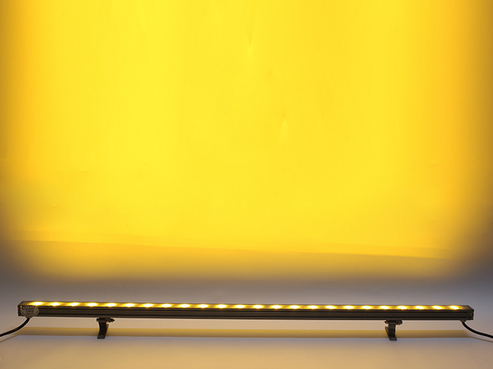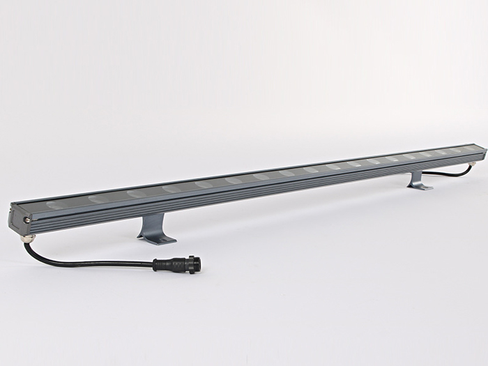 应用较多的LED洗墙灯基本上是选用1W大功率LED管(每个LED管会带有一个由PMMA制成的高光效透镜,其主要功用是二次分配LED管发出的光),呈单线排列(二线或多线排列的我将其归为LED投光灯),大多数LED洗墙灯的LED管都是共用一个散热器,其发光角度一般有窄(20度左右)、中(50度左右)、宽(120度左右)三种,大功率LED洗墙灯(窄角度)的最远的有效投射距离为5-20米,其常用功率大概有9W、12W、18W、24W、36W等几种功率形式,而它们的常用外形尺寸一般为300、500、600、900、1000、1200、1500mm等几种,可以按实际工程应用选择不同的长度和功率密度。