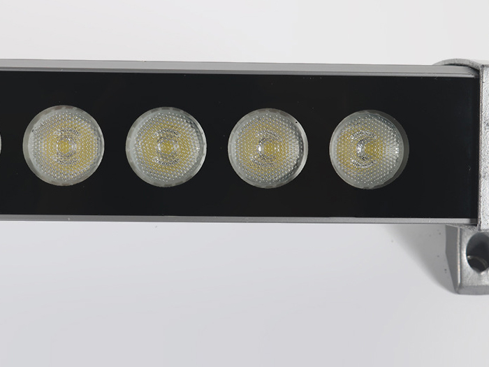 应用较多的LED洗墙灯基本上是选用1W大功率LED管(每个LED管会带有一个由PMMA制成的高光效透镜,其主要功用是二次分配LED管发出的光),呈单线排列(二线或多线排列的我将其归为LED投光灯),大多数LED洗墙灯的LED管都是共用一个散热器,其发光角度一般有窄(20度左右)、中(50度左右)、宽(120度左右)三种,大功率LED洗墙灯(窄角度)的最远的有效投射距离为5-20米,其常用功率大概有9W、12W、18W、24W、36W等几种功率形式,而它们的常用外形尺寸一般为300、500、600、900、1000、1200、1500mm等几种,可以按实际工程应用选择不同的长度和功率密度。
