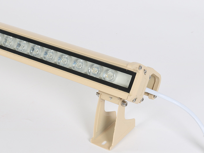 应用较多的LED洗墙灯基本上是选用1W大功率LED管(每个LED管会带有一个由PMMA制成的高光效透镜,其主要功用是二次分配LED管发出的光),呈单线排列(二线或多线排列的我将其归为LED投光灯),大多数LED洗墙灯的LED管都是共用一个散热器,其发光角度一般有窄(20度左右)、中(50度左右)、宽(120度左右)三种,大功率LED洗墙灯(窄角度)的最远的有效投射距离为5-20米,其常用功率大概有9W、12W、18W、24W、36W等几种功率形式,而它们的常用外形尺寸一般为300、500、600、900、1000、1200、1500mm等几种,可以按实际工程应用选择不同的长度和功率密度。